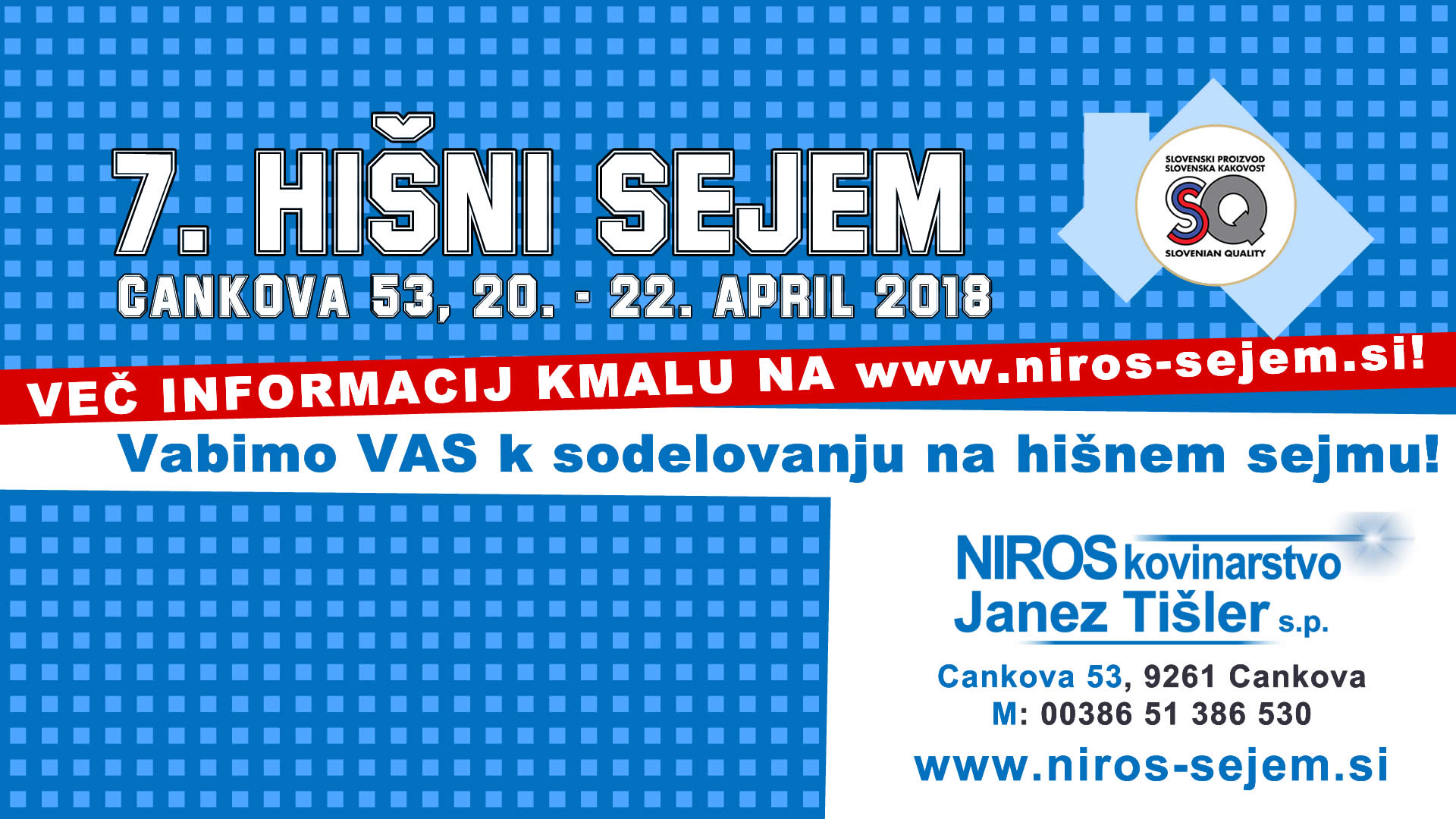 Vabimo vas, da nas obiščete na 7. hišnem sejmu NIROS, Cankova v Pomurju, ki bo od 20. - 22. aprila 2018. Predstavili se bodo razstavljalci iz različnih panog iz Pomurja, kjer bodo predstavili vse za gradnjo in obnovo hiše.
