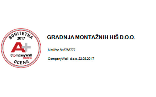 Naše podjetje je iz strani bonitetne hiše CompanyWall Business prejelo certifikat bonitetne odličnosti, s katerim smo se kot poslovni subjekt uvrstili v skupino podjetij, ki ima svetlo prihodnost in je sposobno poravnati svoje obveznosti.